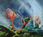 2016Prachtige discusvissen. De felle en kleurrijke vissen zijn mooi om te zien. Een prachtige wanddecoratie.